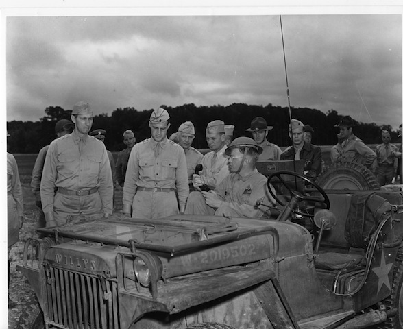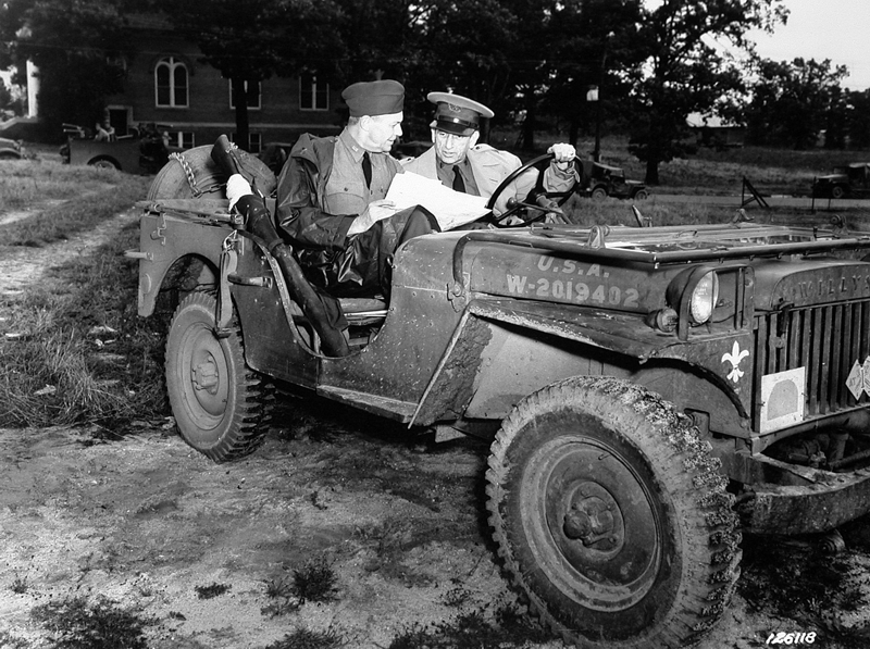 Major General Beightler consults a map next to his Willys Jeep during training maneuvers in 1941. (Source: Ohio Historical Society)