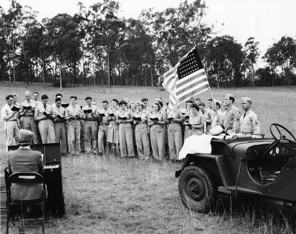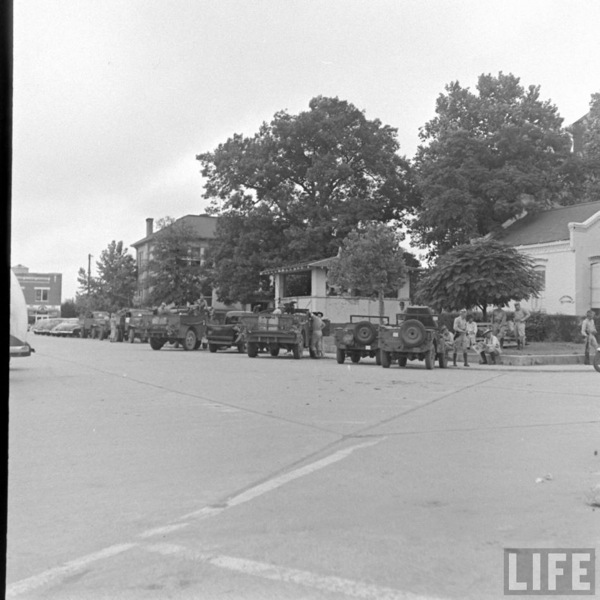 Singer Shirley Lloyd riding in an Army jeep on the way to a USO show. Fort Benning, GA, US. 1942. Photographer: William C. Shrout. SOURCE: LIFE